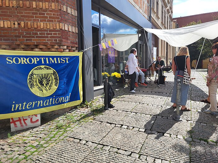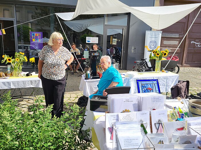 Wieder einmal veranstalten die Clubschwestern am 10.08.2024 ein Benefizcafé am Dom. Clubschwestern vom SI-Club Leipzig sind aus diesem Anlaß in Halle zu Besuch. Mit dem Verkauf von selbst gebackenem Kuchen, Wein und herzhaften Leckereien sowie der Veräußerung von Büchern und anderen Objekten am Flohmarkstand erzielen die Hallenser Soroptimistinnen Erlöse, die dem Frauenschutzhaus zugute kommen.