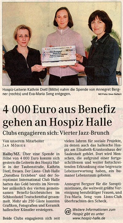 Der Soroptimisten-Club Halle (Saale) und der Frauen Lions-Club "Dorothea Erxleben" überreichen der Leiterin des Hospizdienstes Halle einen Spendenscheck.