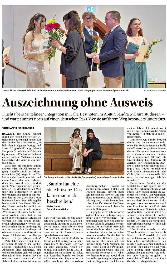 Die Soroptimistinnen gratulieren zum erfolgreichen Schulabschluss und wünschen einen guten Start an der Uni.